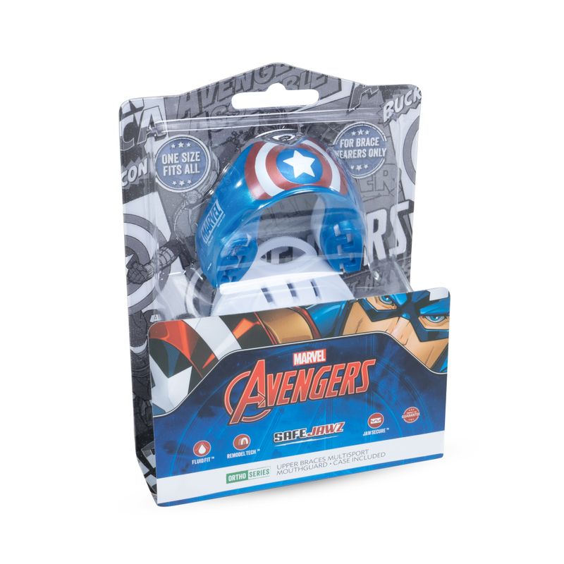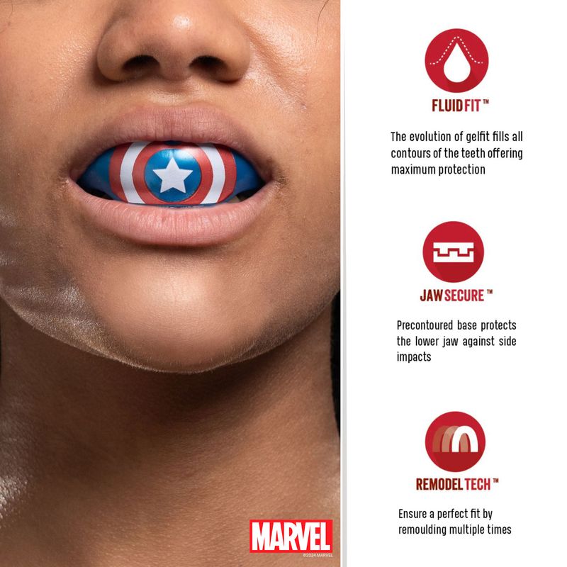 Este protector bucal SAFEJAWZ® de la serie Marvel combina tecnología avanzada de protección con un aspecto llamativo. La tecnología Fluid Fit™ permite que el protector bucal se ajuste de forma delgada y segura en los dientes, sin afectar significativamente la respiración, el habla o la capacidad de beber. El componente Jaw Secure™ también protege la mandíbula inferior y los dientes inferiores; una base preformada y almohadillas de amortiguación elevadas actúan como amortiguadores en caso de impactos laterales.